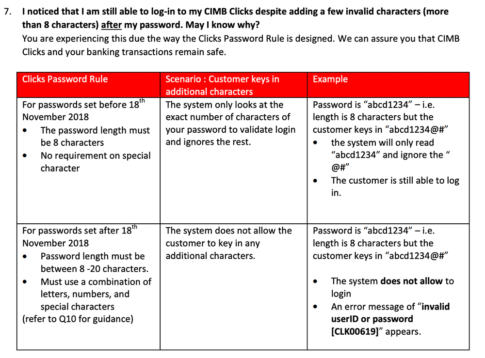 In the FAQ, CIMB has clarified that this is completely normal and it is due to the way the Clicks Password Rule was designed. According to CIMB, this only affects passwords set before 18th November 2018. If you’ve changed your password recently, you can’t login with additional characters added to the actual password. Below is the FAQ on the password issue.