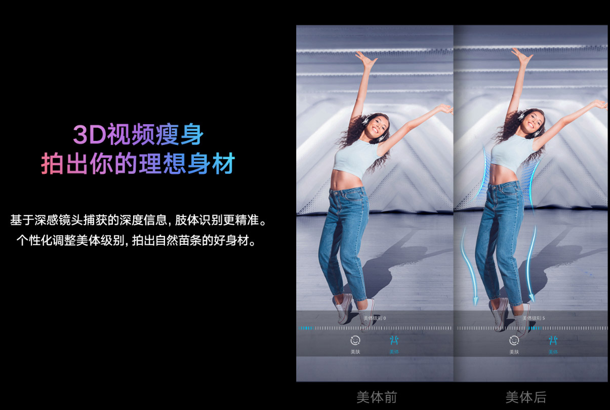 Instead of your typical face beautification features, the V20 is capable of identifying your body accurately using its ToF Camera. It can recognise your limbs and motion accurately and you can shape your body to make it look slimmer.