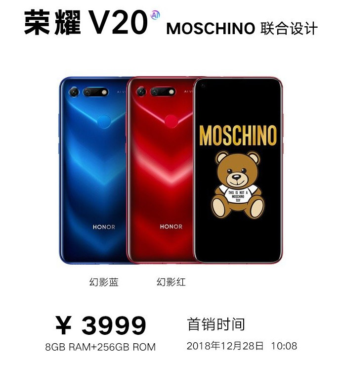 In China, the Honor V20 is priced at 2,999CNY (about RM1,814) for the 6GB RAM + 128GB storage model and 3,499CNY (about RM2,116) )for the 8GB RAM + 128GB storage version. The Moschino edition is priced at 3,999CNY (about RM2,419) and it comes with 8GB RAM + 256GB of storage.