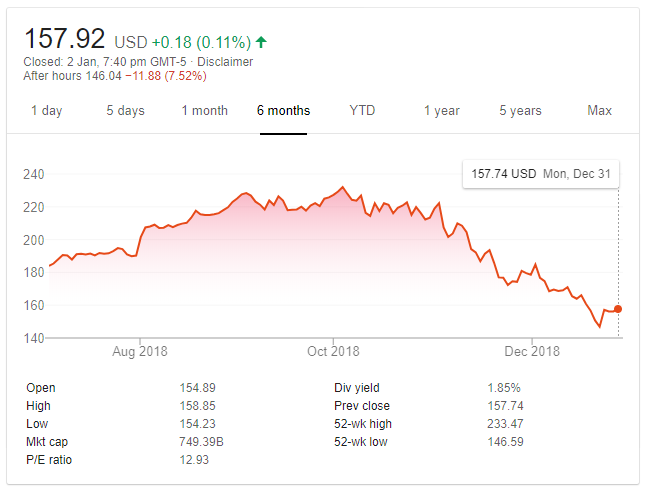 At the moment, Apple is trading at $157.92 which is a significant 32% drop from its record high of $233.47 in October 2018.
