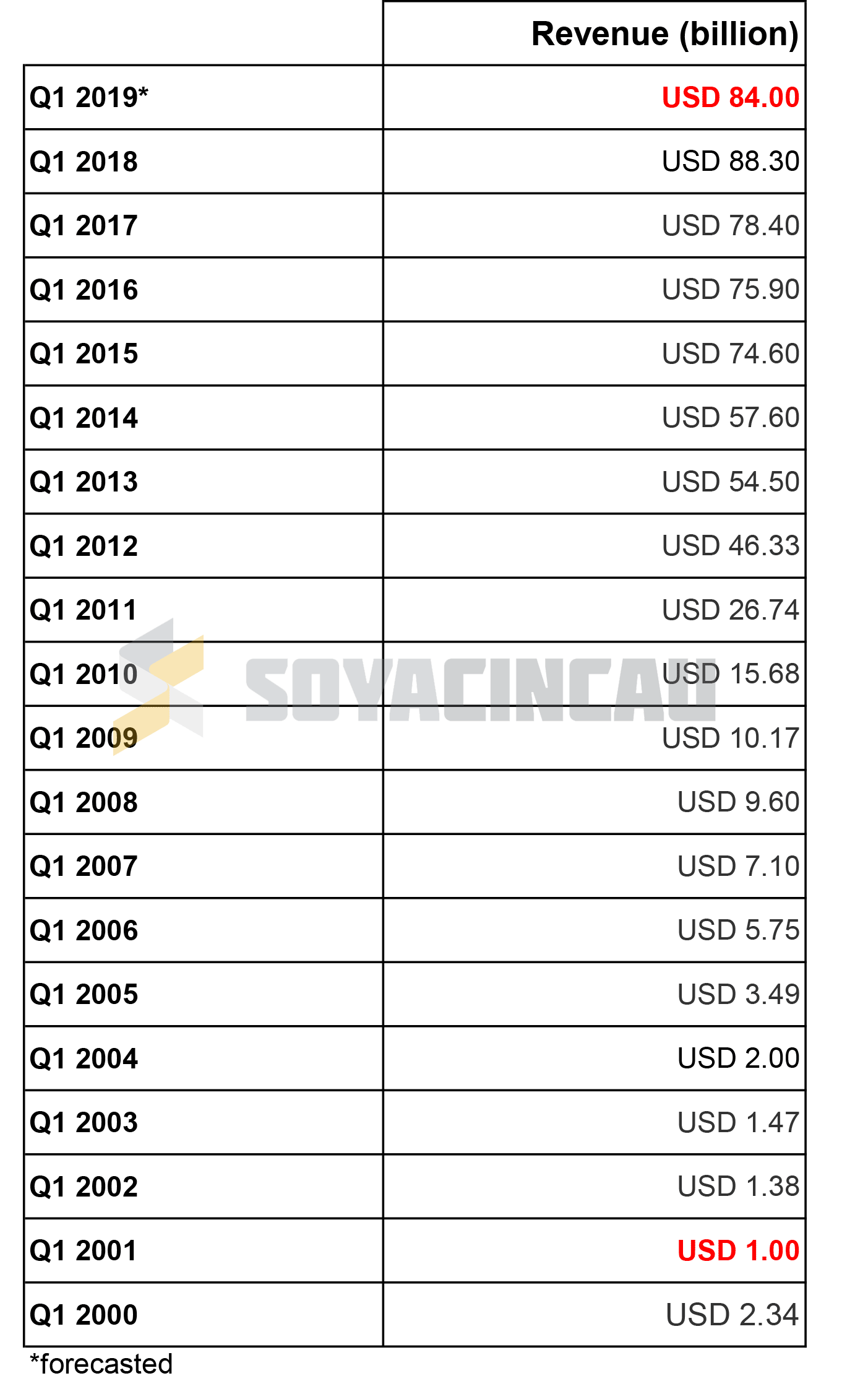 With this revision, this is expected to be the first Q1 revenue decline in 18 years. The last time they posted a decline in revenue for this period is in 2001 and that was before the iPod was introduced in October of the same year.