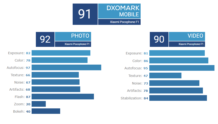 To break it down, the Pocophone F1 scored 92 for photos and 90 for the video category. According to DxOMark, the F1 delivers respectable performance but it lands outside of their top 20 list. They commended the device’s excellent autofocus performance, nice flash pictures and pleasant colours in their test conditions.