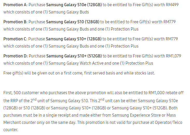 According to their T&C, the devices must be purchased on the same day and on a single receipt from their Samsung Experience Store or Mass Merchant counter. The T&C also states that the rebate offer is not valid if you’re getting the Galaxy S10 from a telco.