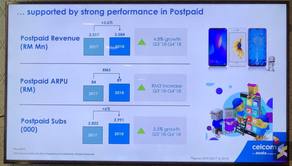 Despite the challenging market situation, the blue telco has managed to increase its revenue by 1.1% from RM6.592 billion in 2017 to RM6.667 billion in 2018. The postpaid business has shown steady growth with increase in revenue, Average Revenue per User (ARPU) and subscription. Celcom currently has 2.99 million postpaid subscribers.