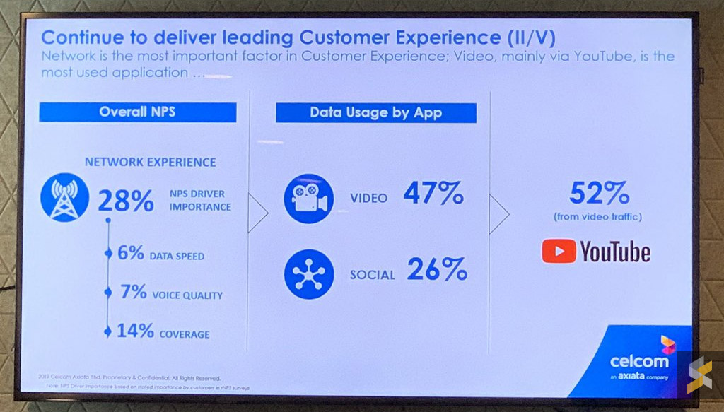 A Celcom subscriber consumes an average of 12.4GB per month in 2018, which is almost double the average usage from 2017. The biggest usage is obviously video and 52% of video traffic comes from YouTube.