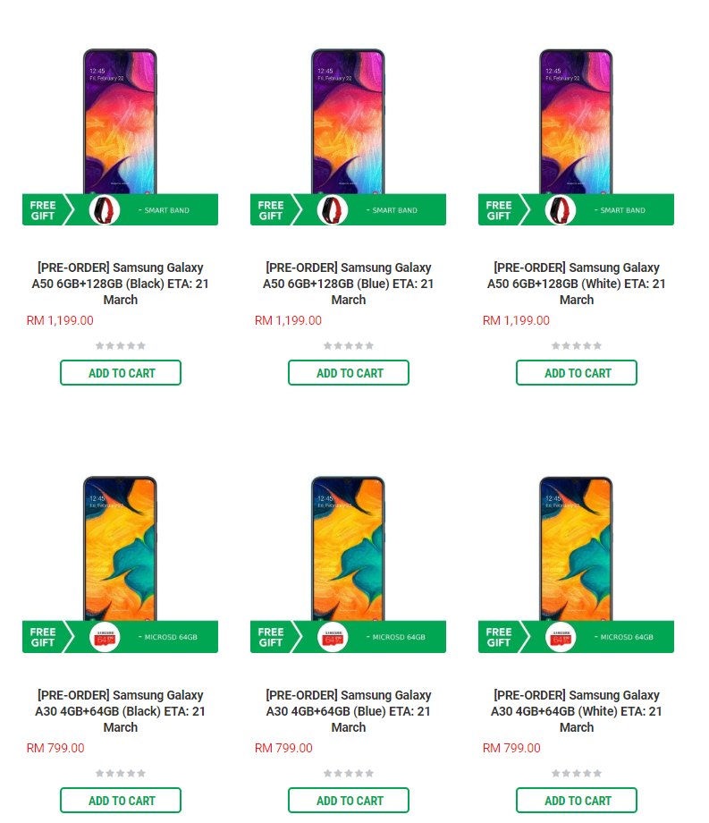 On Senheng’s online store, the Galaxy A30 is offered with a free 64GB microSD card while the A50 is offered with an unspecified