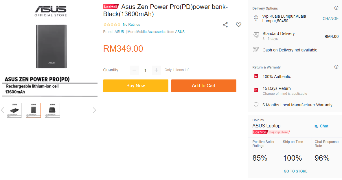 The ZenPower Pro (PD) is going for RM349 and it’s available on Lazada Malaysia. It has a capacity of 13,600mAh and the USB-C port pushes a maximum output of 45W. ASUS claims that you can charge an ASUS ZenBook 3 UX390UA notebook from 5% to 41% in 30 minutes.