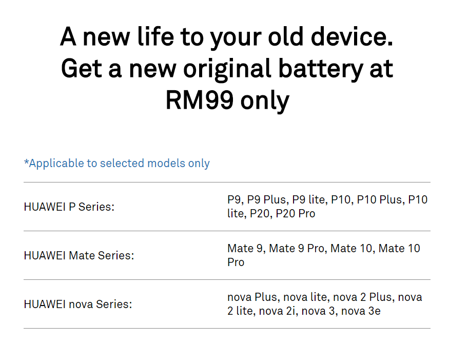 The RM99 battery replacement campaign will start from 8th April until 7th May 2019. This program is applicable to selected models which include the Huawei P9, Mate 9 and the Nova Plus.