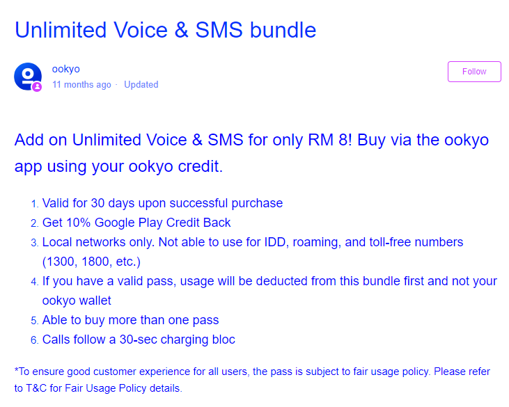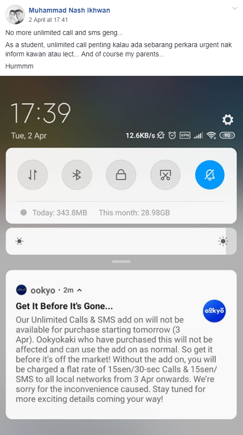 According to a couple of users in an Ookyo community group on Facebook, the Unlimited Calls and SMS add-on has been discontinued starting 3rd April 2019. As a result, users will have to pay a per use rate of 15 sen/30 seconds for calls and 15 sen per SMS, which are applicable to all local networks.