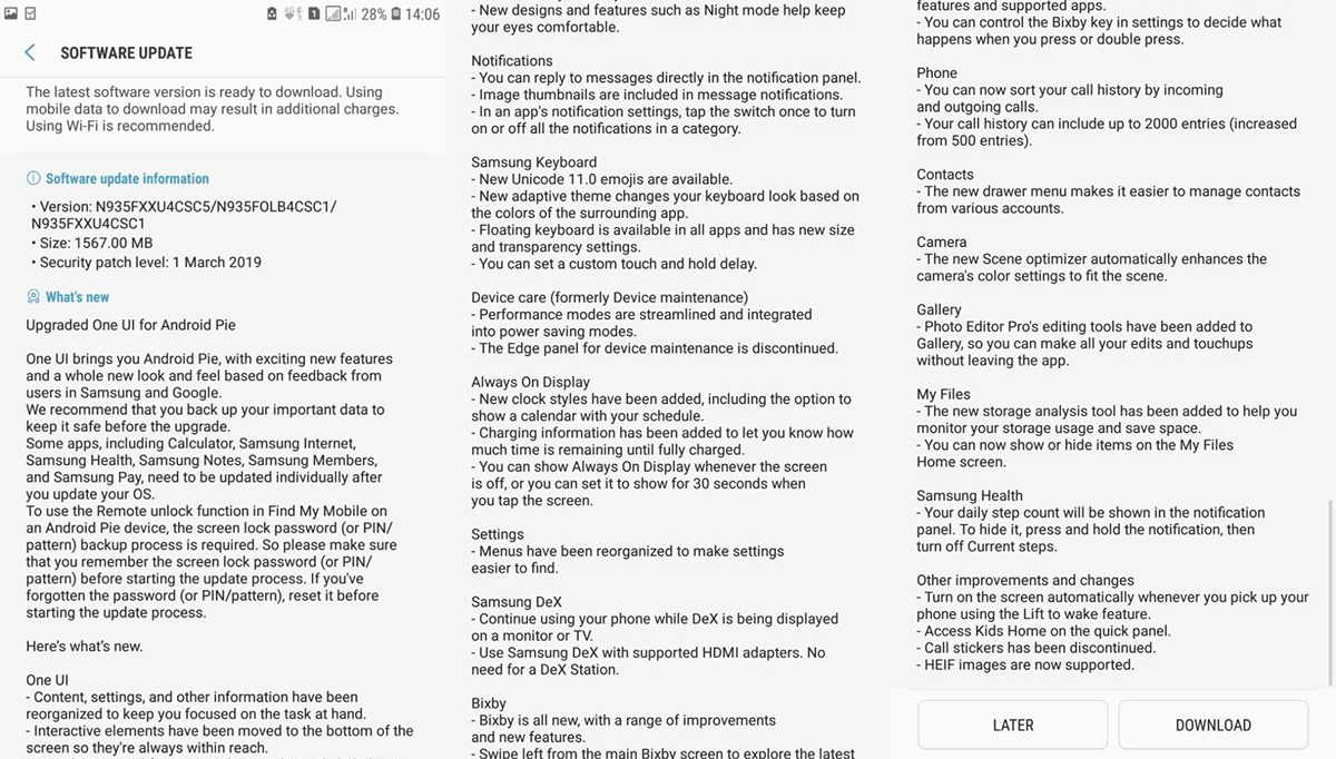 The software update is about 1.57GB in size and it is advisable that you use an unmetered WiFi connection to download the update. Apart from bringing the latest interface, the update also carries a newer 1 March 2019 Android security patch.