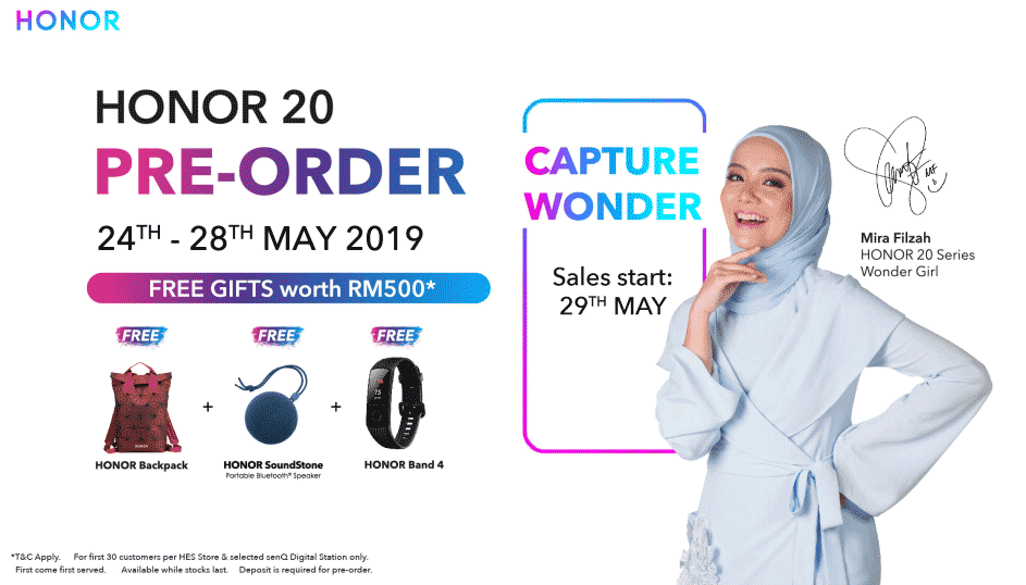 Last week, Honor Malaysia had announced their pre-order promo which was originally scheduled between 24-28 May 2019. The Honor 20 device will be bundled with RM500 worth of freebies which include an Honor Backpack, Honor SoundStone and Honor Band 4. The device was supposed to go on sale nationwide beginning 29th May 2019 just in time for the Raya.