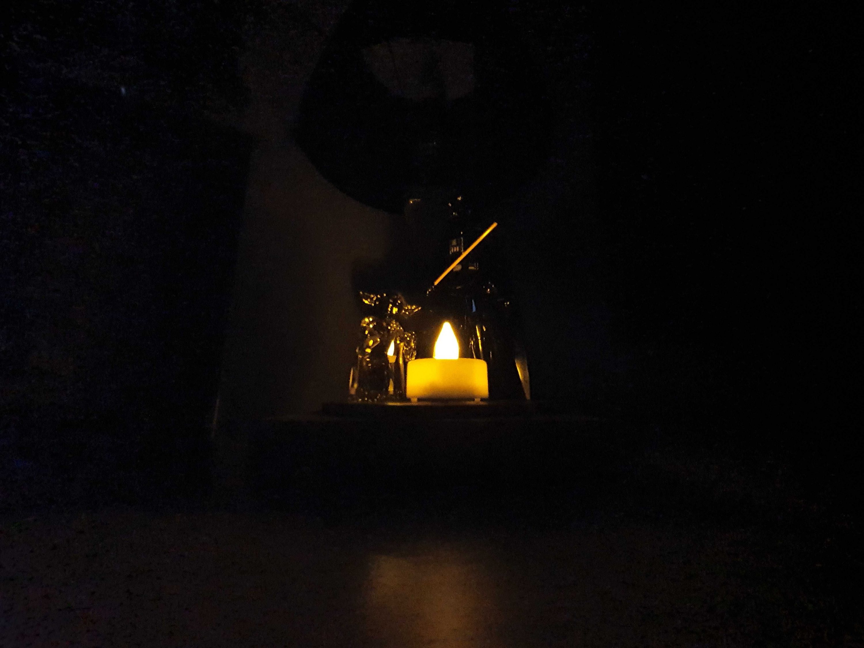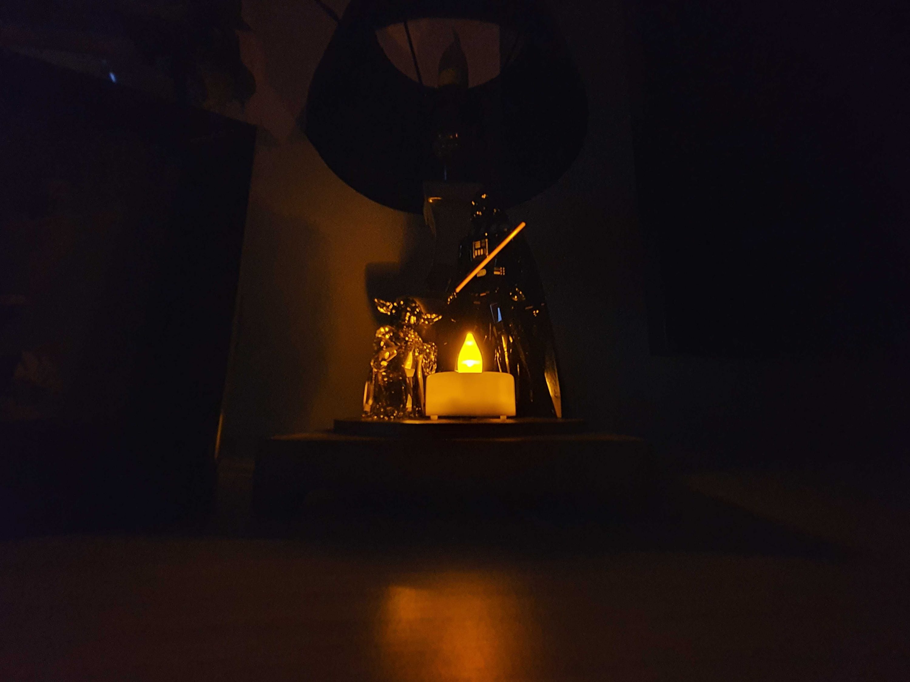In this sample with a single LED candle in the room, the image is not only brighter but it’s sharper with decent noise reduction. You can finally see the Darth Vader figurine next to the candle.