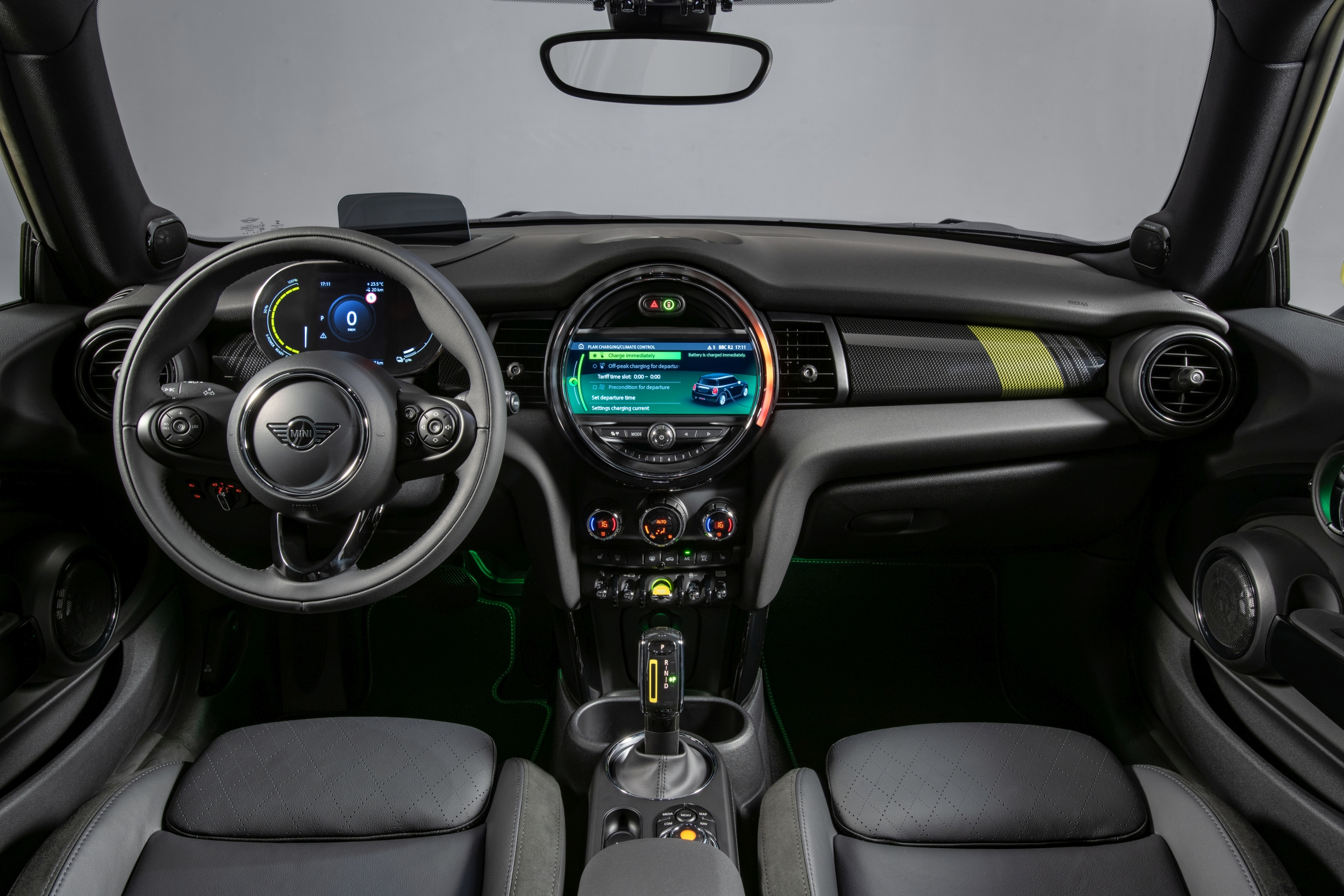 On the outside, you get a different grill that comes with a prominent Mini Electric Logo along with some yellow accents. Even the side mirrors are painted yellow as well. The Cooper SE gets a 16″ Mini Electric Revolite Spoke design wheels and there’s also the optional 17″ Mini Electric Corona Spoke wheels that come with an asymmetrical design.