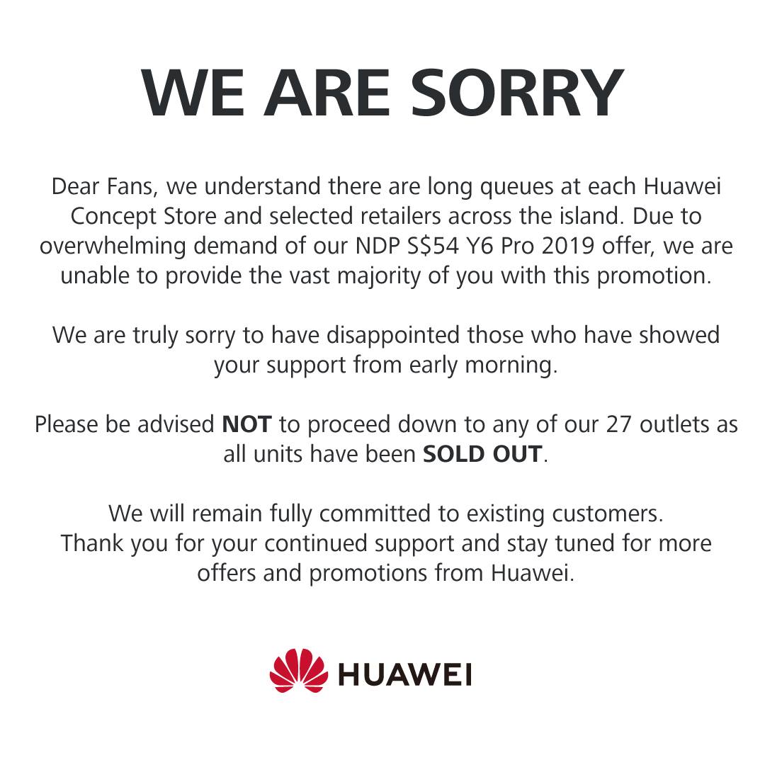 Customers at Jewel Changi Airport, Vivo City, NEX and Toa Payoh Huawei outlets have since been notified by outlet staff that only 20 to 30 units were allocated to each shop. The Chinese company has also issued an apology on social media: