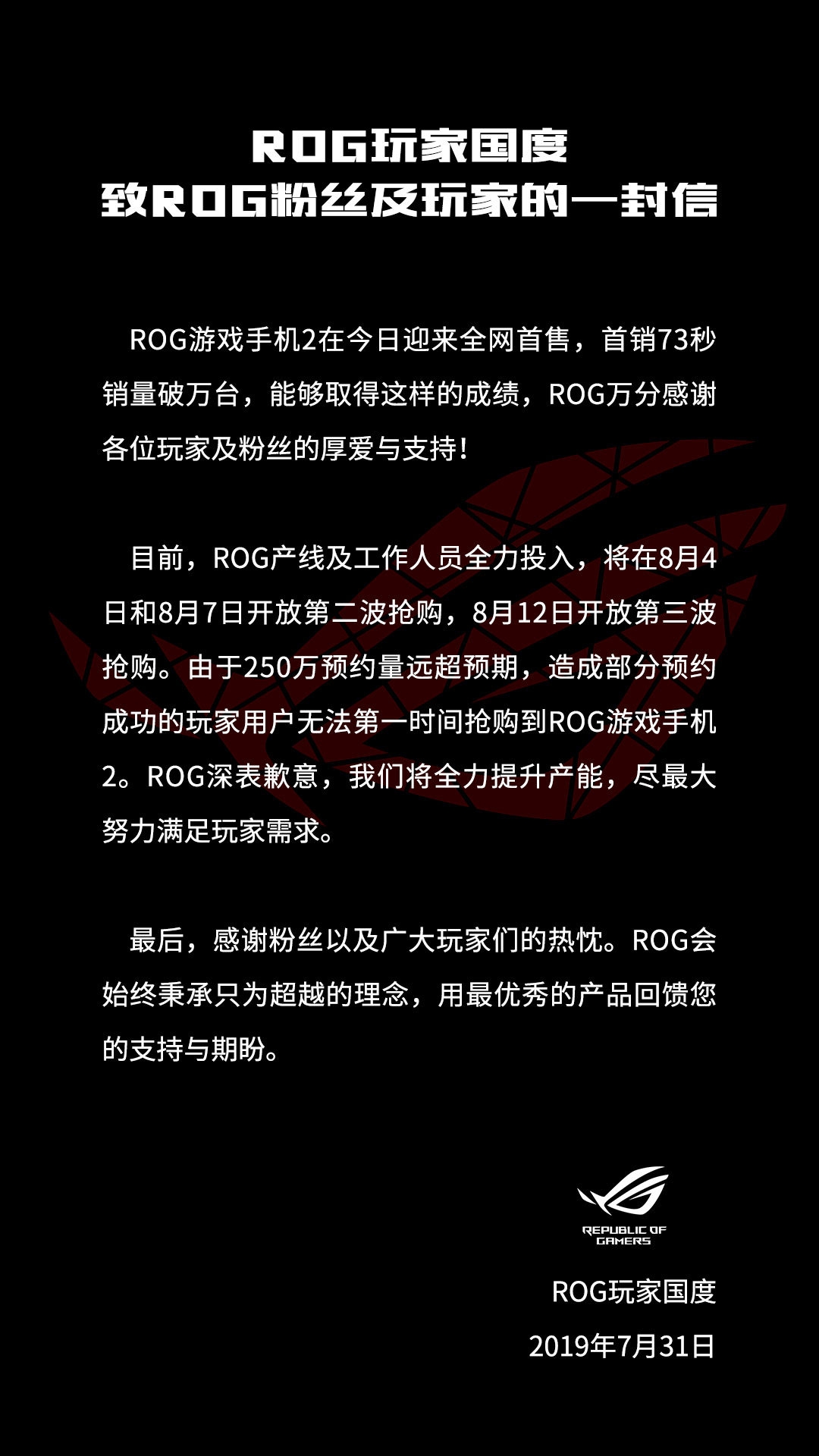 According to the latest Weibo post by the ROG, they have sold 10,000 units during the first flash sale and the next opportunity to get it is on the 4th, 7th and 12th August 2019. The Weibo post also mentions that they have received over 2.5 million “pre-booking” and they are working hard to increase supplies to fulfil demand.