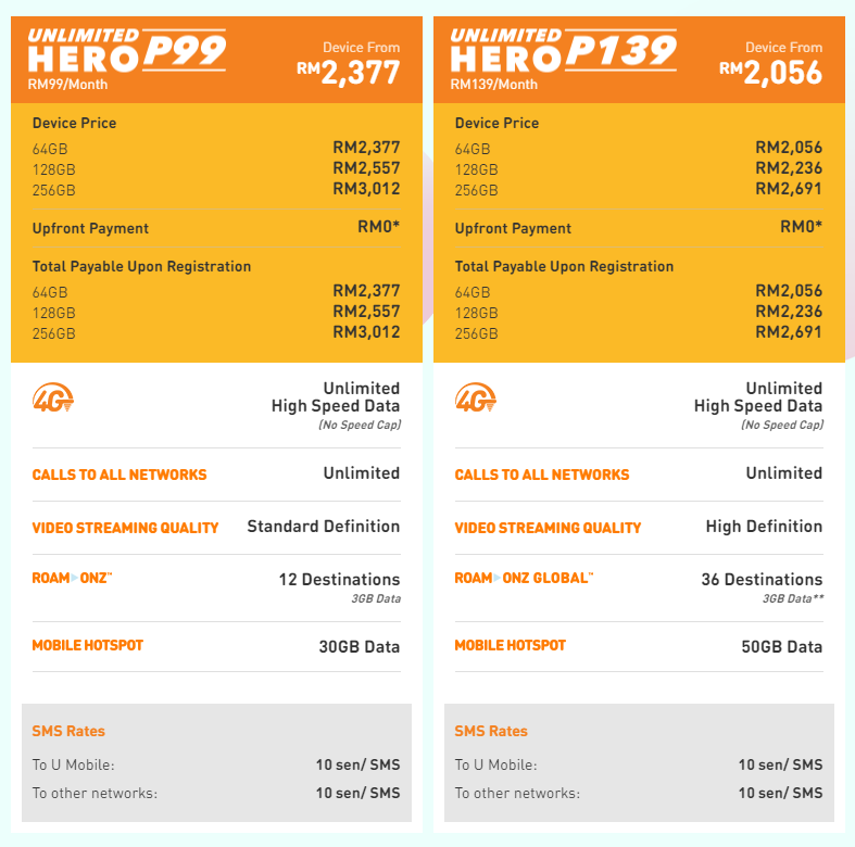 You have two Unlimited Hero postpaid plan options that are priced at RM99 and RM139. Both plans offer unlimited calls and high-speed data but the higher P139 plan offers unlimited HD video streaming, more mobile hotspot data and Roam-Onz data roaming in more countries.