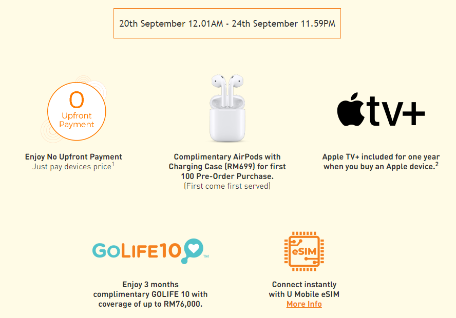U Mobile is offering complimentary AirPods with charging case worth RM699 to the first 100 pre-order customers while stocks last. Interestingly, U Mobile is also offering eSIM for the first time with the introduction of the new iPhone 11 series.