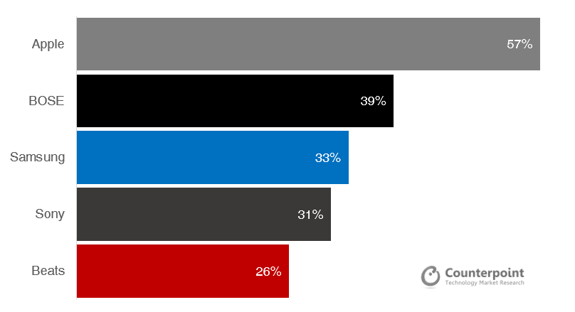 So what does the market say about all of this? According to a report from global research firm, Counterpoint, Apple’s Airpods is the most preferred wireless headphones in the U.S., ahead of Bose, Samsung, Sony, and Beats. The AirPods is the clear winner with 57% of user preference, while Bose comes in 2nd place with 39%. In 3rd place, comes Korean company Samsung, with a 33% rating.