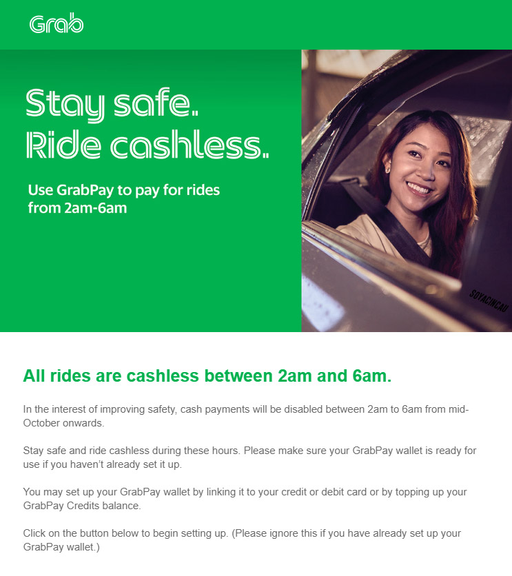 Grab riders take note! Grab will be disabling cash payments for GrabCar rides between 2am to 6am from mid-October onwards. According to the e-hailing provider, this is implemented in the interest of improving safety.