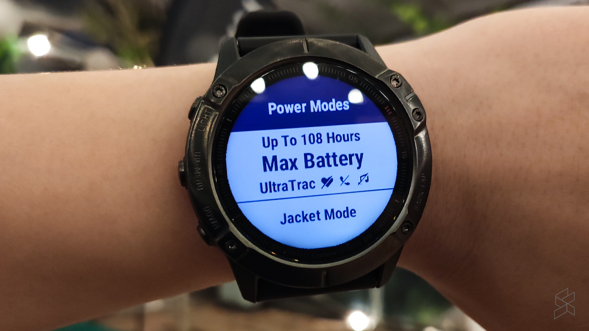 There’s a rather comprehensive Power Manager application on the Fenix, which gives you battery estimates of different modes and sensor settings, including a Battery Saver mode that has an estimate of up to 64 days on a single charge.
