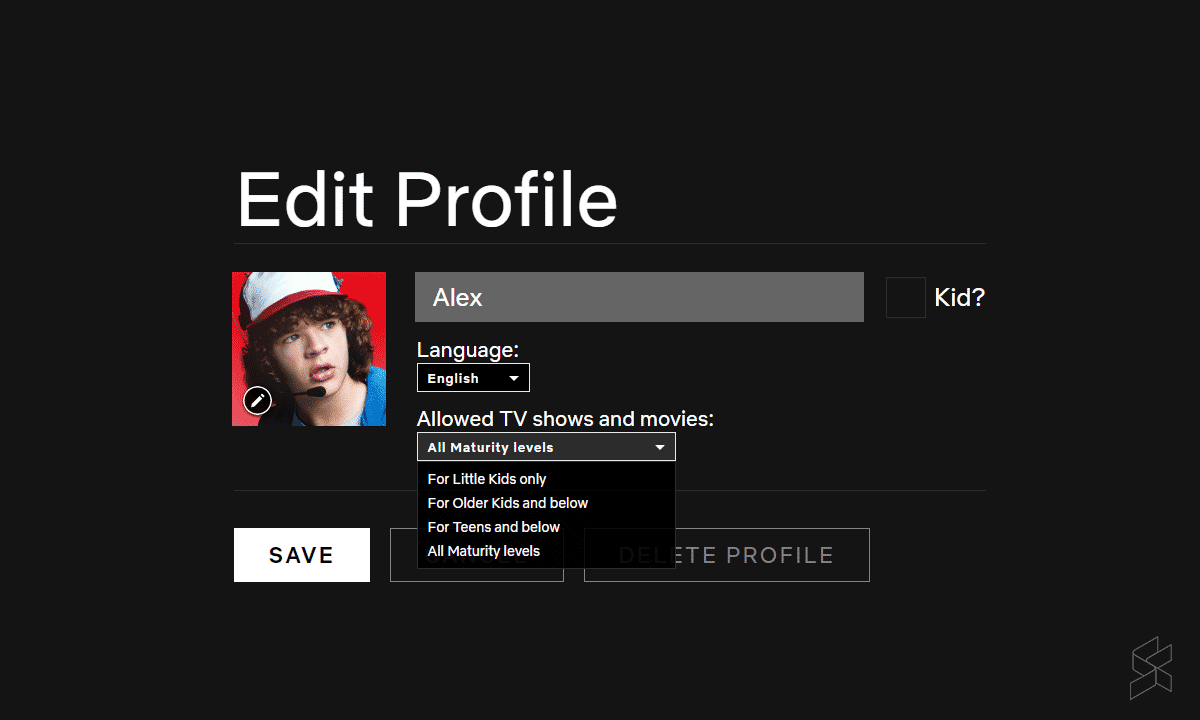 Parents can easily create additional profiles for their children and you can have a maximum of 5 profiles in one subscription. When you create a profile from the home screen, you can choose the maturity levels for TV shows and movies using the drop-down menu. You can even do this on existing profiles anytime by clicking on Manage Profiles button. Below is the step by step guide: