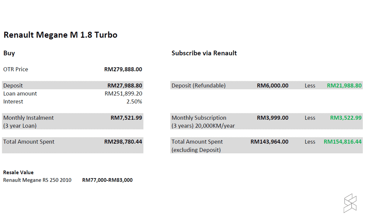If you’re looking for a hot hatch, Renault is offering the Megane RS 280 Cup on subscription with the manual variant going for RM3,999/month on a 3-year contract. Across three years, you’ll pay RM154,816 less on a subscription which is half of what you would pay in total if you were to buy it via a loan.