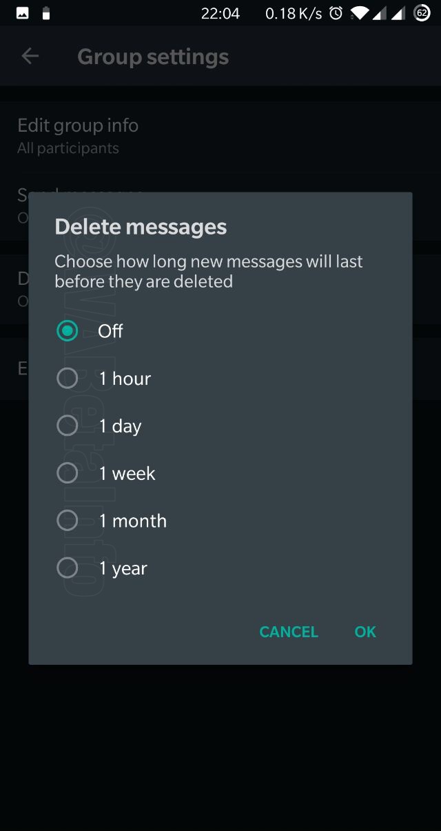 The feature can be toggled in Contact Info or Group Settings (only for the Group Administrator), and there are time period options of 1 hour, 1 day, 1 week, 1 month, or 1 year. It appears that the feature will affect all messages sent in a single conversation or group chat, and the feature is also compatible with Dark Mode on WhatsApp as well.