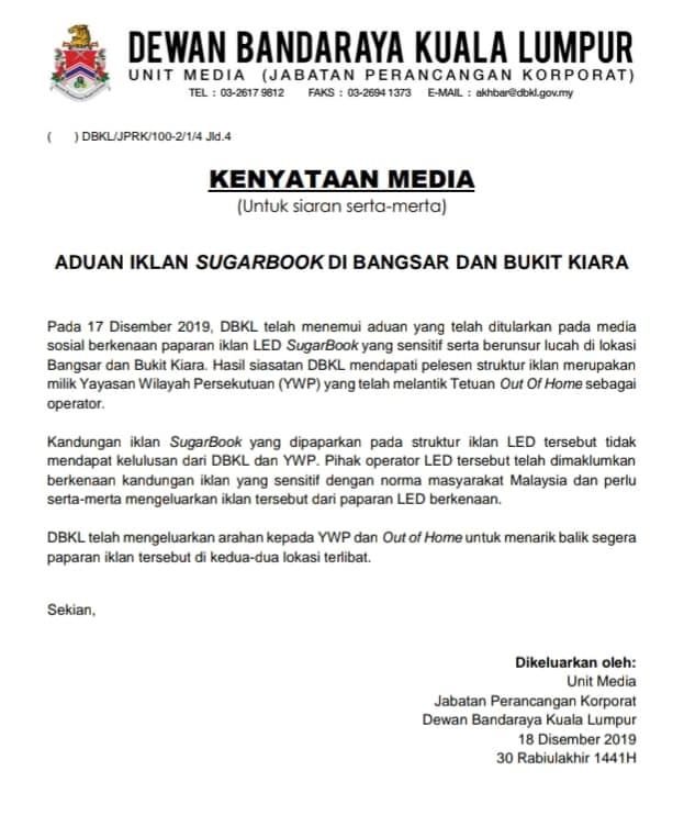 According to DBKL’s press statement, they have received a number of complaints when the ads went viral on social media. They added that the ad copy was not approved by DBKL and YWP, and they have ordered an immediate removal from the LED billboard.