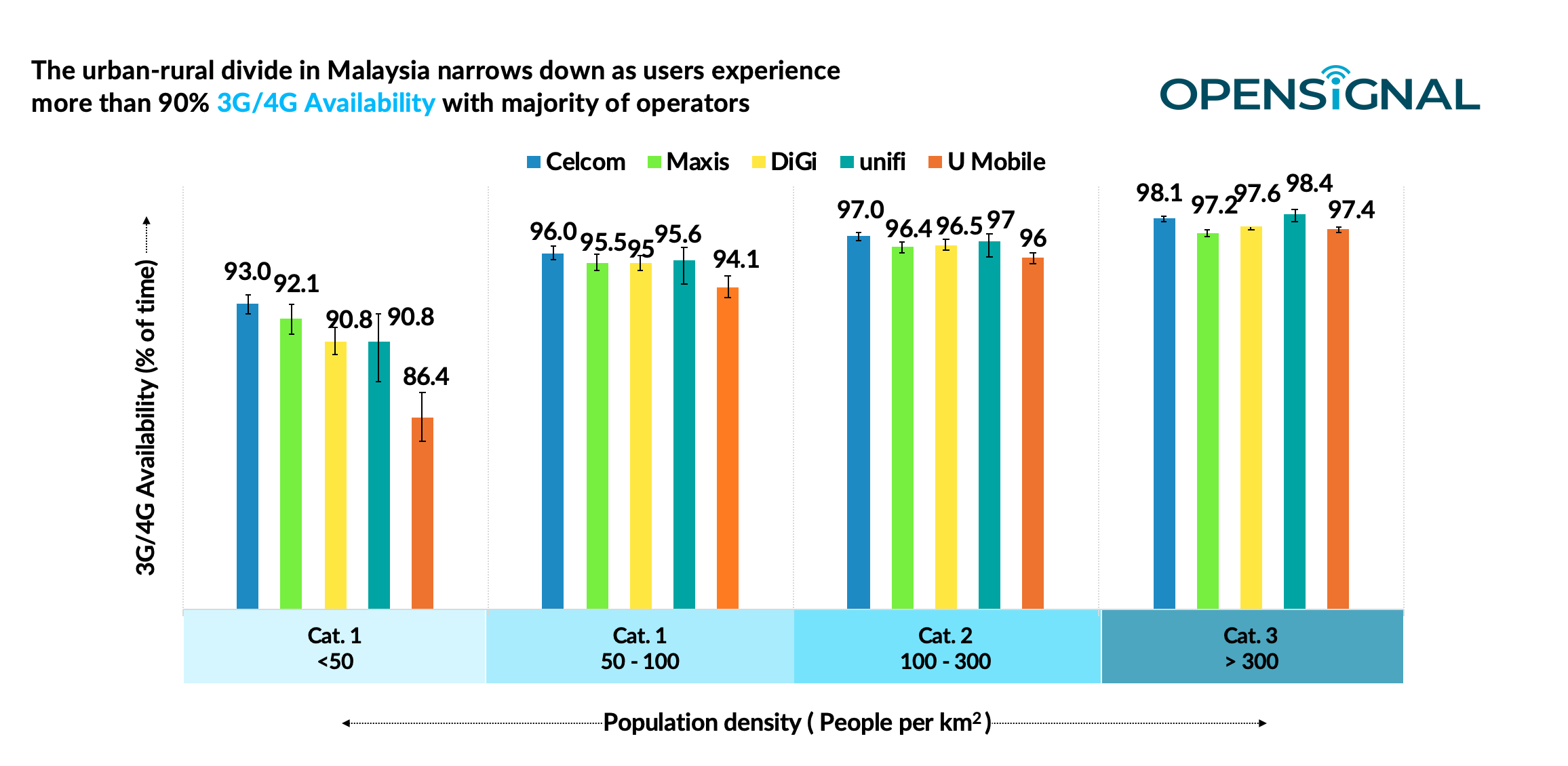 According to Opensignal, Celcom offers the highest 4G availability across urban to less populated rural areas. In cities with a population of over 300 people per sq. km, Celcom has 90.7% availability while in rural areas with a population of up to 50 people per sq. km, the blue telco still has a respectable 74.3% 4G availability.