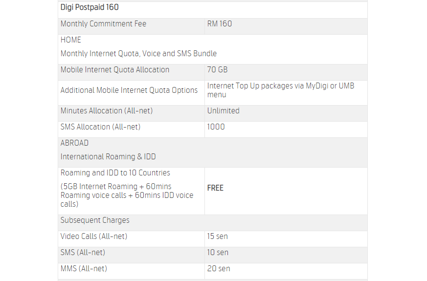 For Digi Postpaid 160 and 190, it looks like nothing has changed. It still comes with 70GB and 100GB of data respectively with unlimited calls and 100 SMS. You also get borderless roaming for free. Strangely, Digi does not offer loyalty bonuses for the Postpaid 120, 160 and 190 plan.