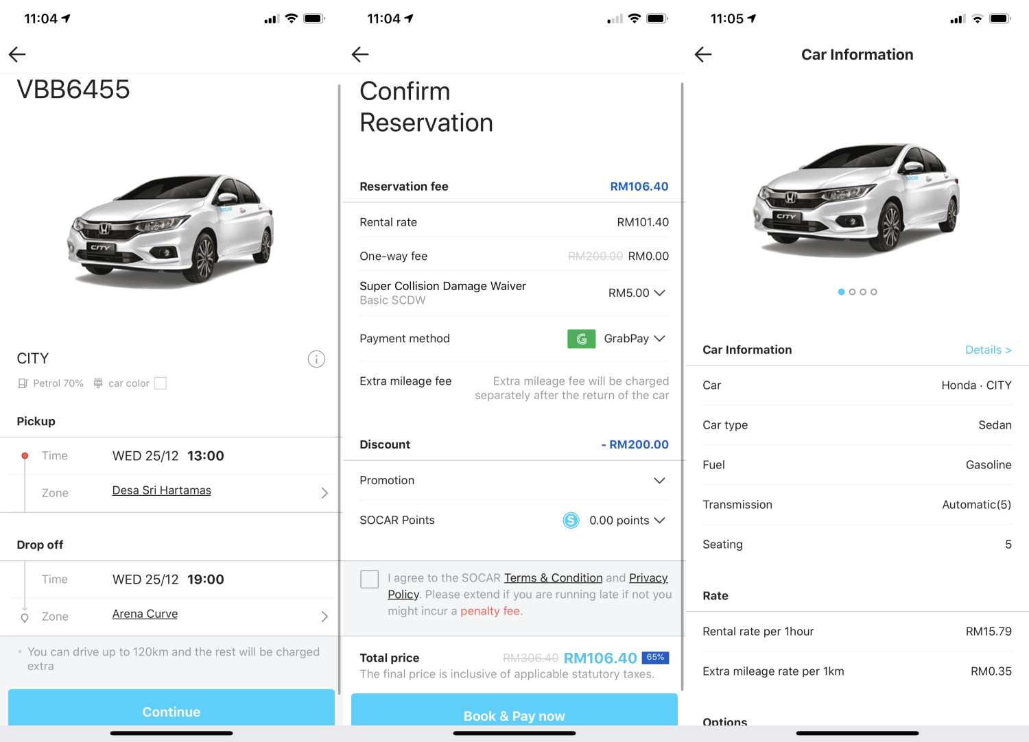 Do note that SoCar provides a mileage of 20 km per hour or 240 km per day for their bookings. If you exceed the mileage, you’ll need to pay for excess usage which starts from RM0.35 per km depending on vehicle.