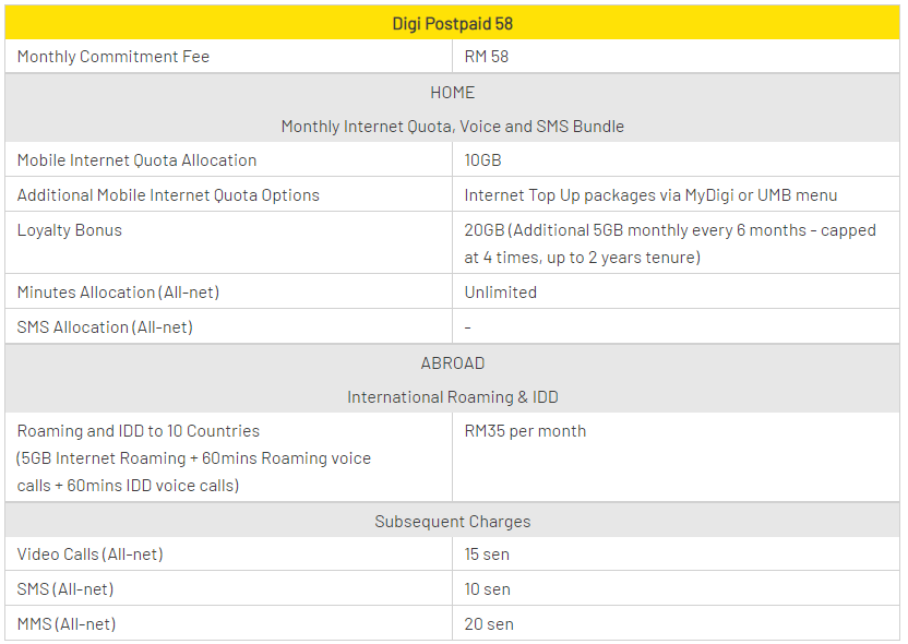 Apart from Postpaid 80, Digi has also revised its entry-level Postpaid 58 which now comes with welcome and loyalty bonus. By default, the plan offers unlimited calls and 10GB of all-day internet for RM58/month. However, with the additional bonuses, you’ll get three times the data after two years of tenure.