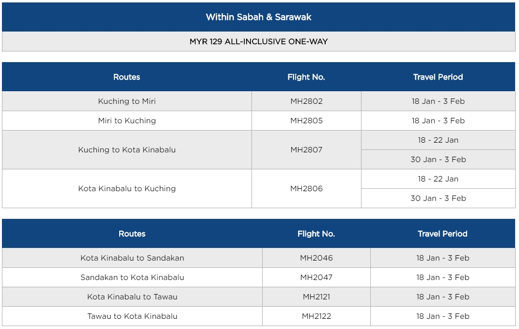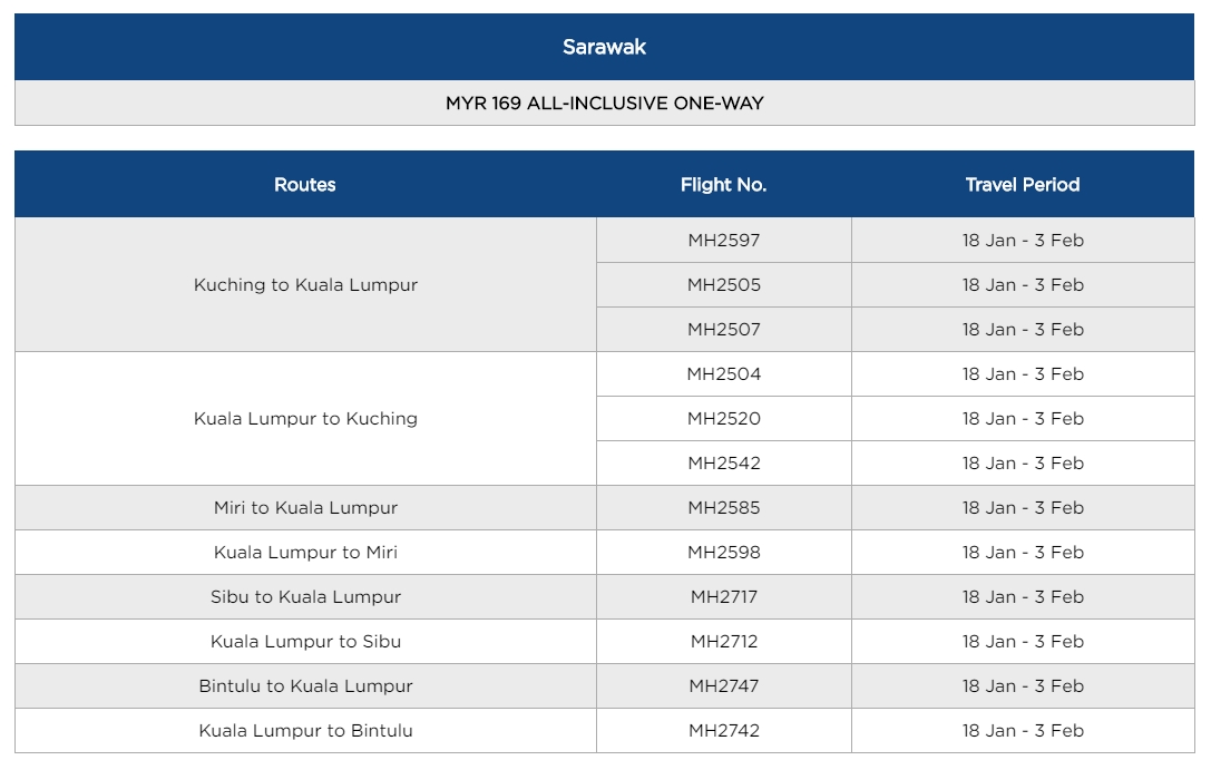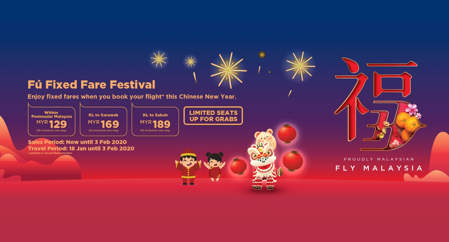 Apart from AirAsia, Malaysia Airlines is also offering fixed-fares for those travelling during the Chinese New Year season. The promo covers domestic flights within and between East and West Malaysia.