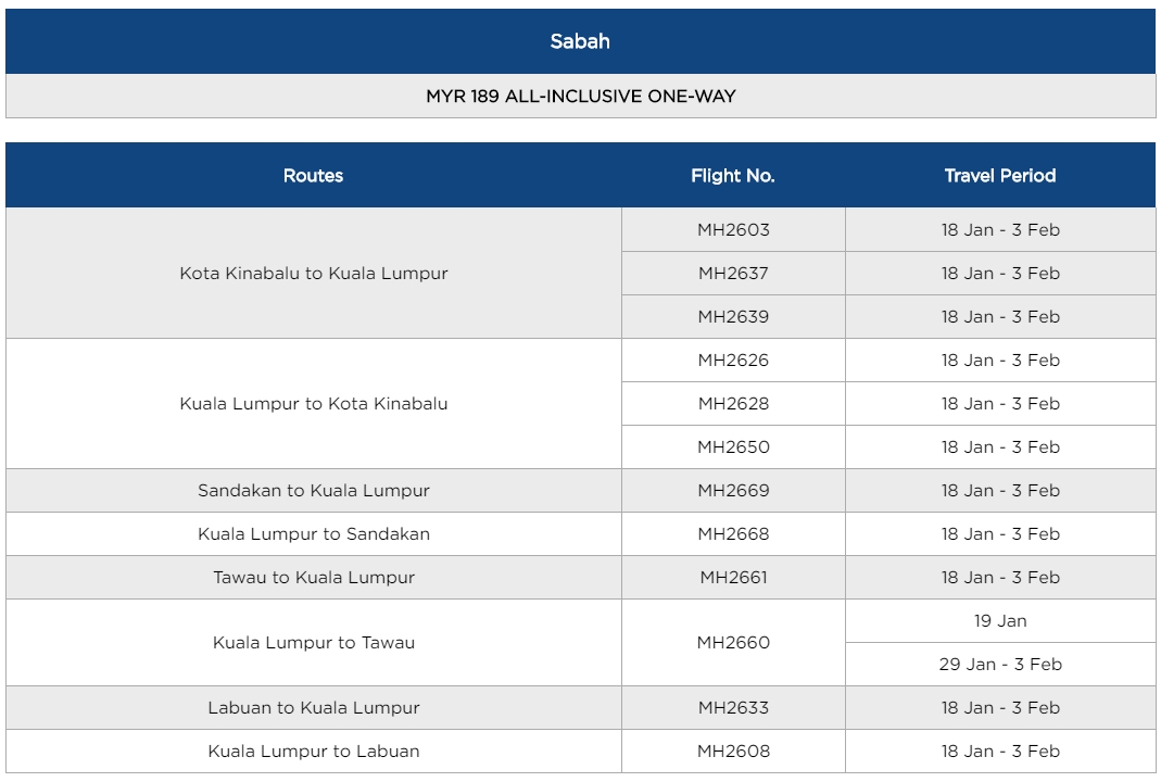 The fixed-fare seats are now available for purchase until 3rd February 2020. This is applicable for travel period between 18th January to 3rd February 2020. You can refer to the list of applicable flights below: