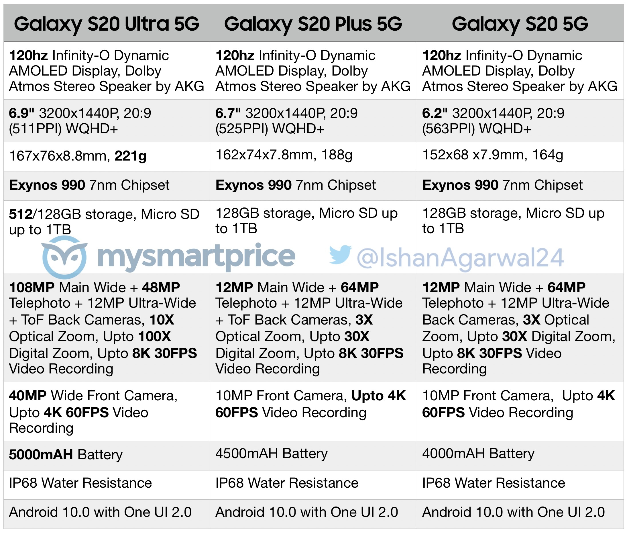 In the next month or two, Huawei and Samsung will be releasing their latest flagship smartphones that are going big on photography. The Samsung Galaxy S20 series is scheduled to launch on 11 February and now a purported spec-sheet has surfaced online thanks to serial leakster Ishan Agarwal via MySmartPrice.