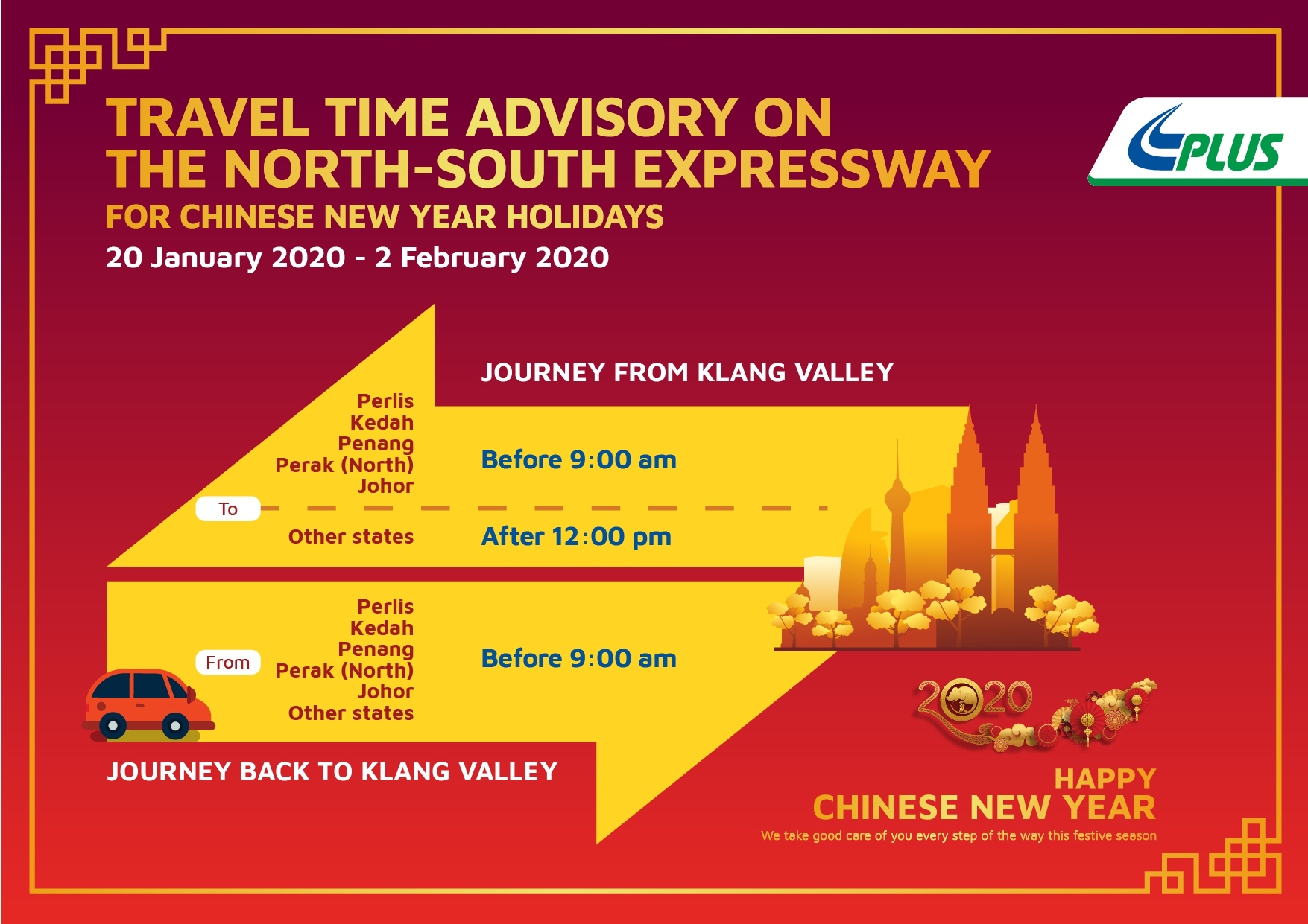 Chinese New Year will be a busy season for the North-South Expressway. For a smoother journey, highway concessionaire, PLUS, has revealed its travel time advisory for the festive season between 20th January to 2nd February 2020.
