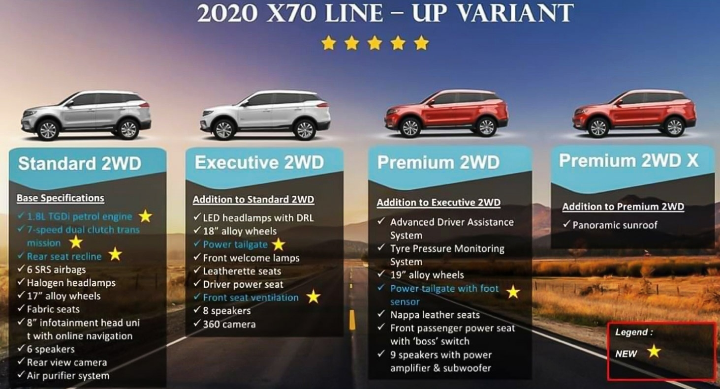New for 2020 is rear-seat recline which is available across the range. For the Executive variant and above, there’s power tailgate as well as front seat ventilation. The Premium model also gets power tailgate but it comes with the added foot sensor. Similar to last year’s model, the X70 Premium gets all the bells and whistles which includes Advanced Driver Assistance System, 19″ alloy wheels, nappa leather and a 9-speaker setup with subwoofer.