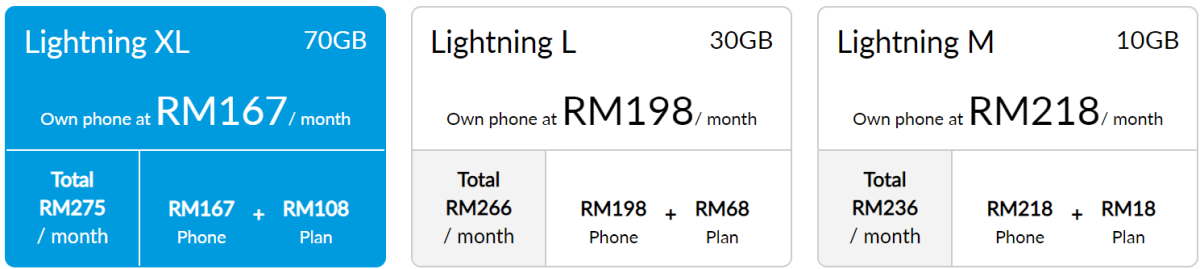 There are 3 “add-ons” that you’re required to choose from: Lightning M, L, and XL, with monthly device payments of RM151 for M, RM130 for Mega L, RM99 for Mega X, along with an additional 10GB, 30GB, and 70GB respectively. Note that you’ll still need to pay for the actual postpaid plan itself—ie, RM108 for the Lightning XL plan.