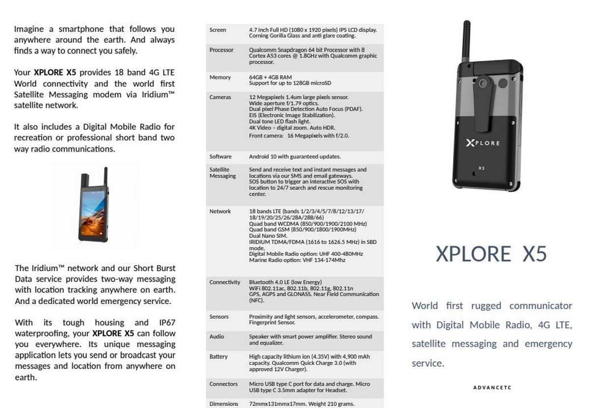 According to XOX, the first device to be introduced is the Xplore X5 which offers a combination of 18 4G LTE bands with Iridium satellite networks. It also has Digital Mobile Radio which allows short band two-way radio communications.