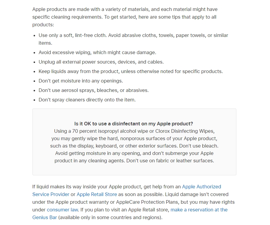 Even if you use normal disinfecting wipes, Apple also reminds you to avoid excessive wiping which might cause damage. Although some Apple devices may come with water resistance, do note that liquid damage isn’t covered under the standard Apple warranty. If there’s liquid getting into your Apple product, you are advised to seek help from an authorised Apple Service Provider as soon as possible.