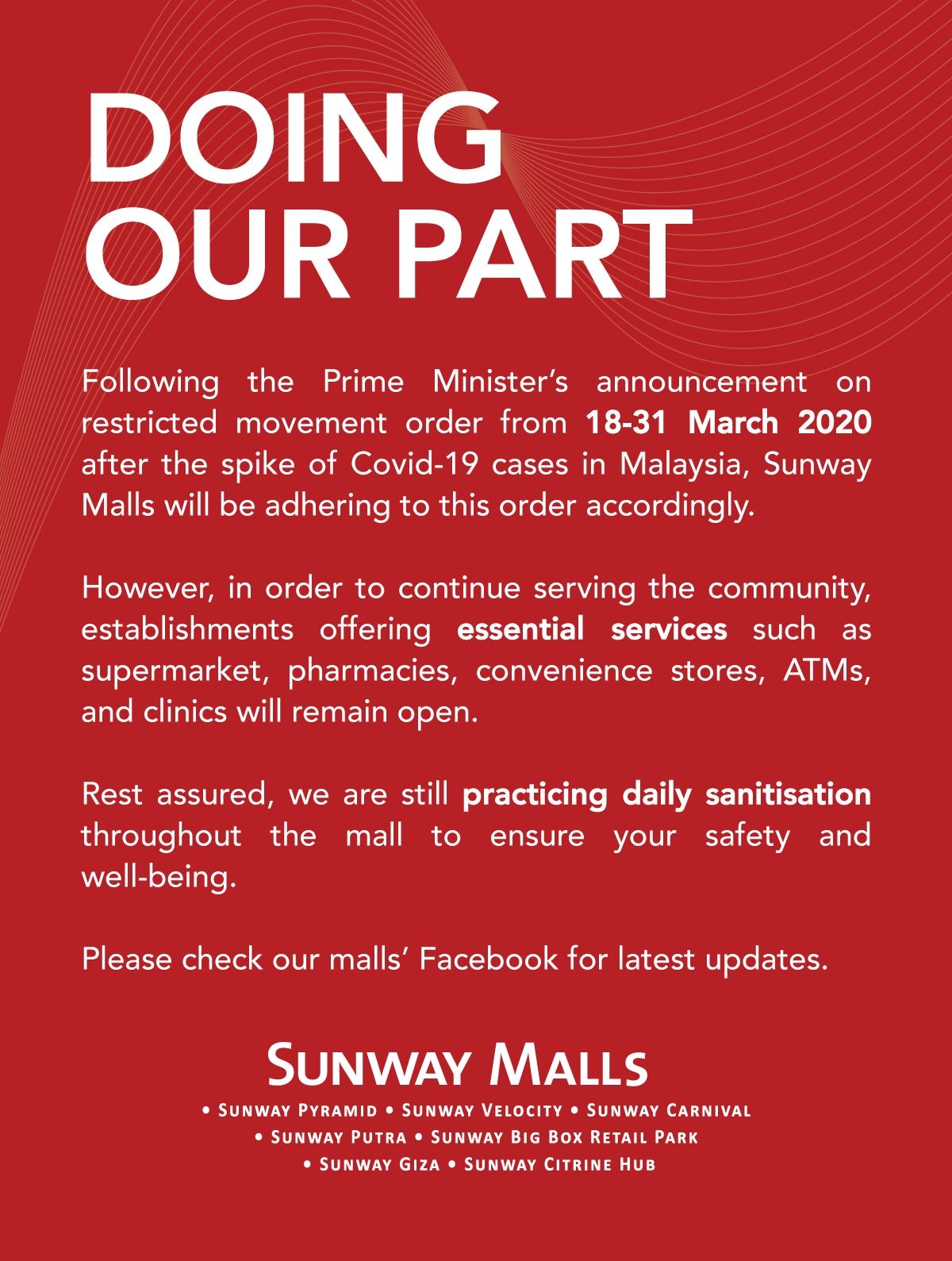According to Sunway, its malls will be partially open. Establishments with essential services such as supermarket, pharmacies, convenience stores, ATMs and clinics will remain open.