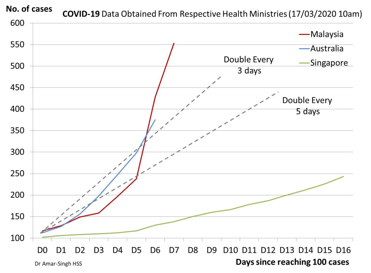 For those who are still unconvinced about what is happening locally please take a look at the graph (shown above) which shows the growth of the coronavirus (COVID-19) in Malaysia in comparison to Singapore where it is in control and Australia which may also be in the same direction that we are going. The graph shows the change in our epidemic since we reached 100 cases. You can see the enormous exponential growth (i.e. unrestricted growth) in our country. We expect that the virus is now spreading extensively in the community and we have thousands of cases. We can expect to start to see a wave of seriously ill persons in the next 2 to 4 weeks and a wave of deaths in the weeks following that.