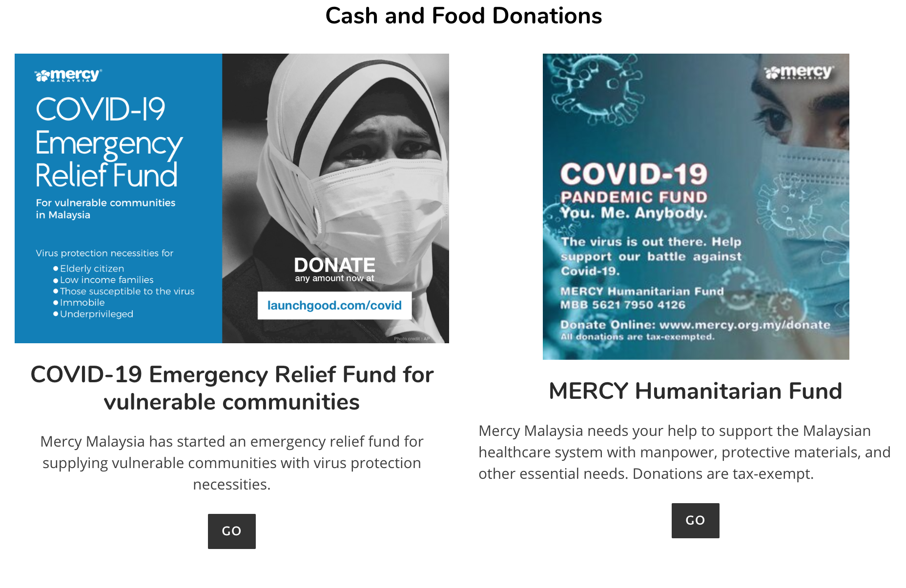 Individuals can choose to provide cash and food donations to organisations like Mercy Malaysia, The Lost Food Project, The Hospital Cleaner’s Union, among others. Funds will go directly to these organisations to buy food and supplies for underprivileged communities as well as those working tirelessly during this crisis.