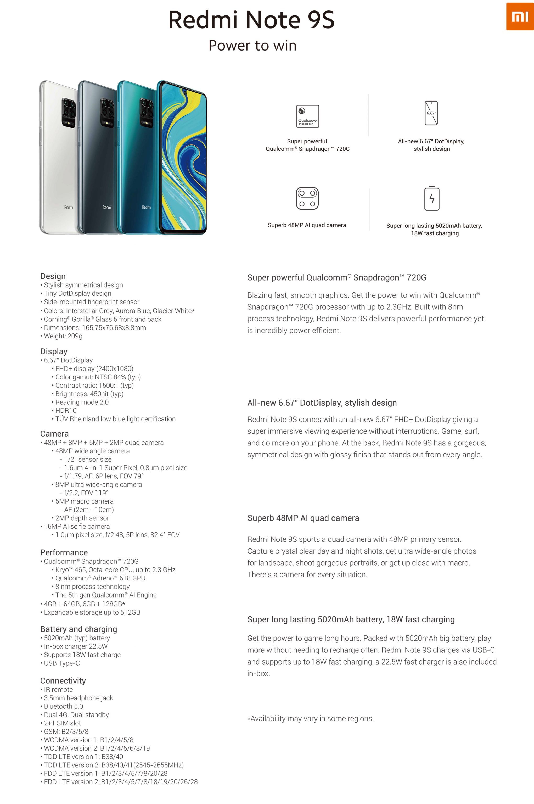 The Redmi Note 9S comes with a 5,020mAh battery that’s rated to last more than 2 days on a single charge. It supports 18W fast charging via USB-C but it is bundled with a 22.5W charger. The device still gets a 3.5mm headphone jack and an Infrared blaster.