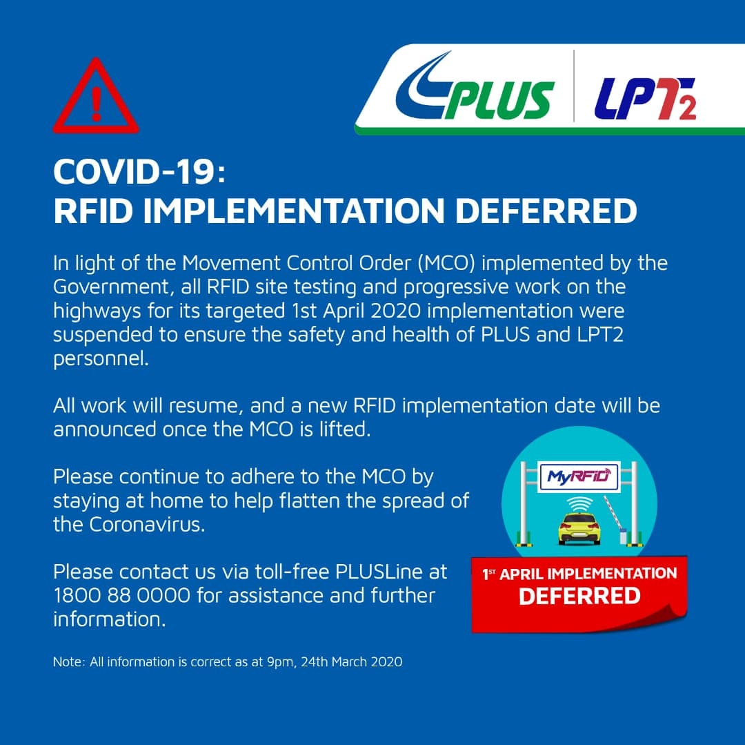 According to PLUS, the safety and health of PLUS employees is their main priority, and all testing and progressive works to implement the RFID system has been suspended temporarily under the Movement Control order (MCO). The implementation works will continue after the MCO is lifted and a new date will be announced later.