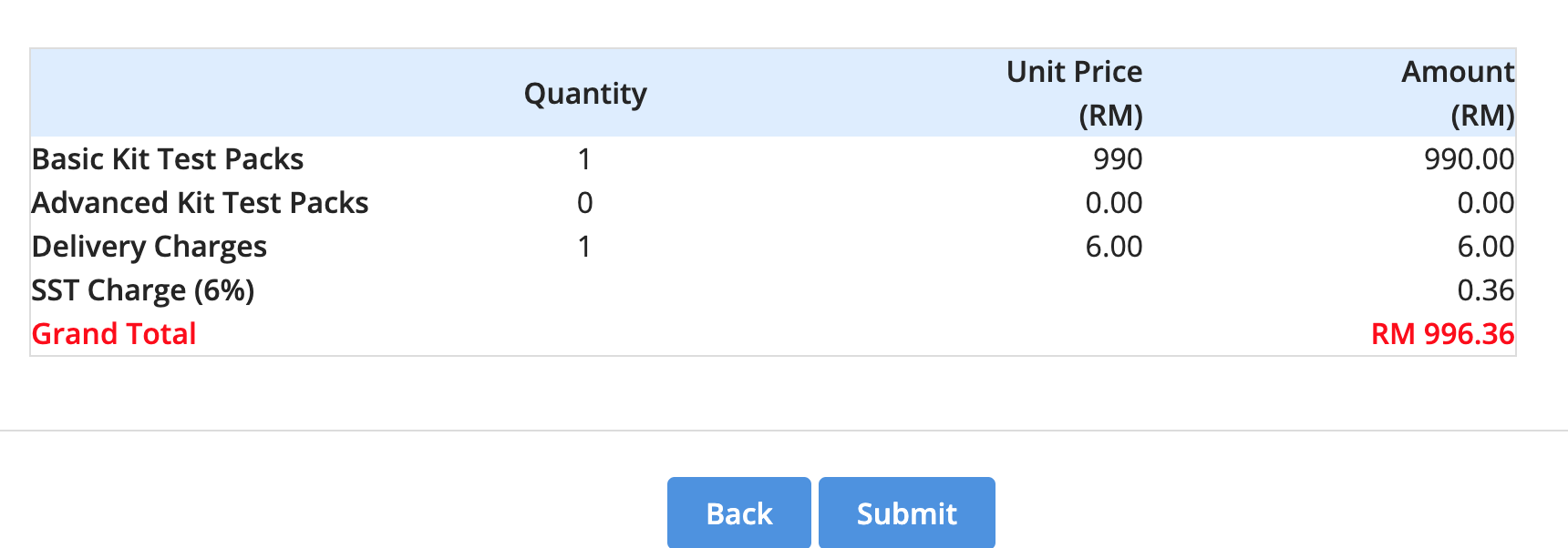The regular test kit tests IgM (the largest antibody) whereas the upgraded kit tests for both IgM and IgG (most common antibody). These antibodies are produced within 3-7 days of infection. It takes around two weeks for the kits to be delivered and the total amount for the regular kits (with 10 units) plus SST and delivery fee is RM996.36 while the advanced testing kit costs RM751.36 all-in for a pack of 5.