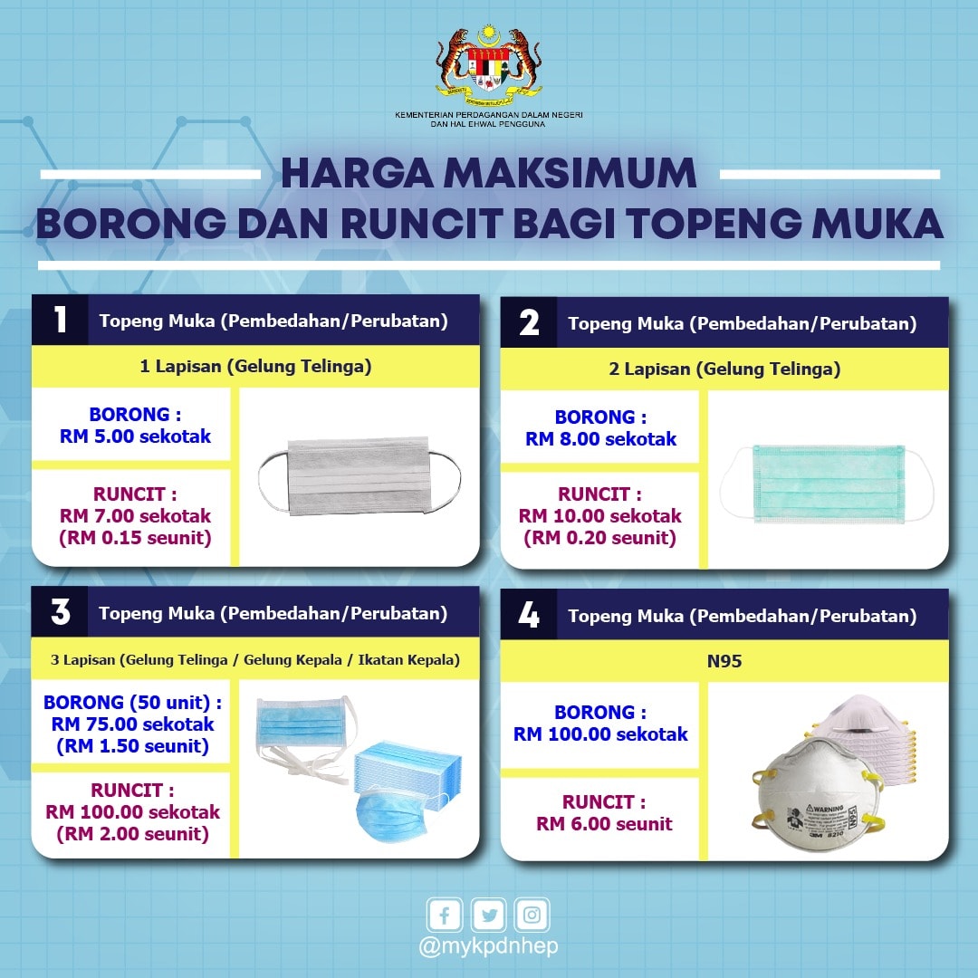 The government had recently announced that they will soon lower the ceiling price of face masks from the current RM2. The new price will be known after the Ministry of Domestic Trade and Consumer Affairs conducts a meeting with members of the industry.