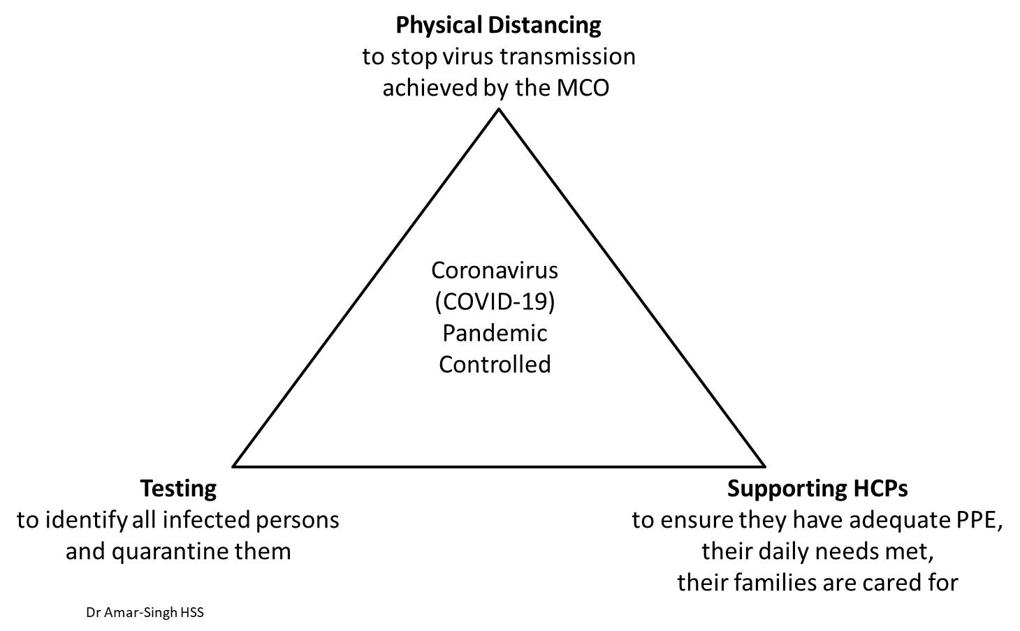 There are three things that we need to emphasise, that would enable us to move forward. Three corners or points of a triangle that are critical for us to endure this period and deal with this epidemic (see the figure). If even one is broken, we will not be able to halt the epidemic.