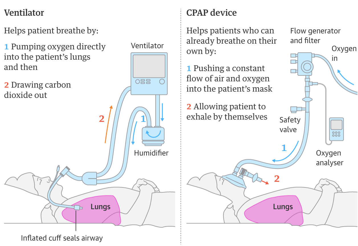 Right now, Continuous Positive Airway Pressure (CPAP) devices are being used in China and Italy as a less invasive method to deliver air and oxygen to patients’ lungs, but the device is short supply in Britain.