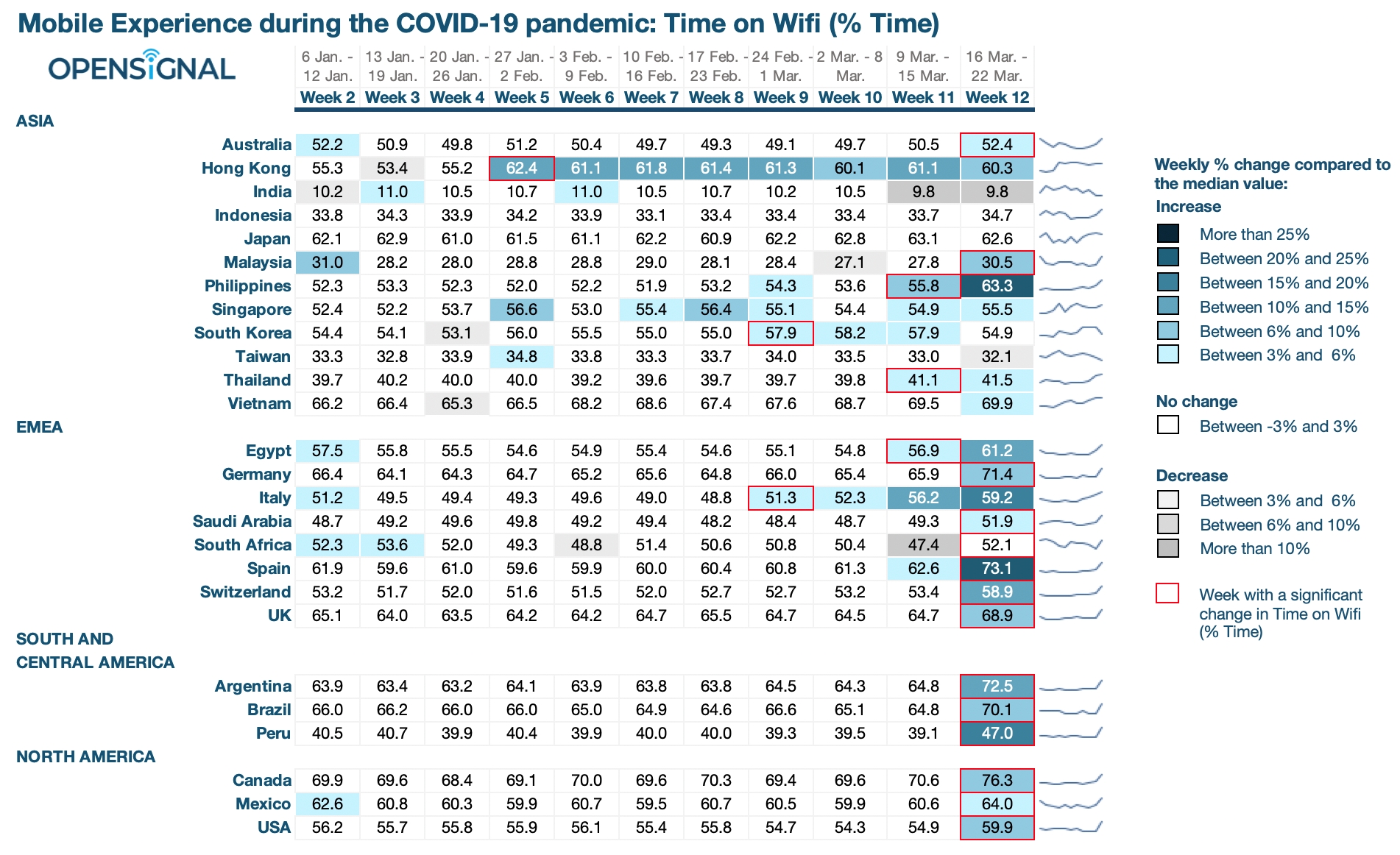 It is also worth pointing out that Taiwan, which has pretty good infrastructure also records a low average of 32.1% time on WiFi. In Taiwan, most of their operators are offering unlimited quota and they have one of the best mobile data experiences in the region on 4G LTE. In fact, time spent on WiFi in Taiwan even decreased on Week 12 compared to the median value.